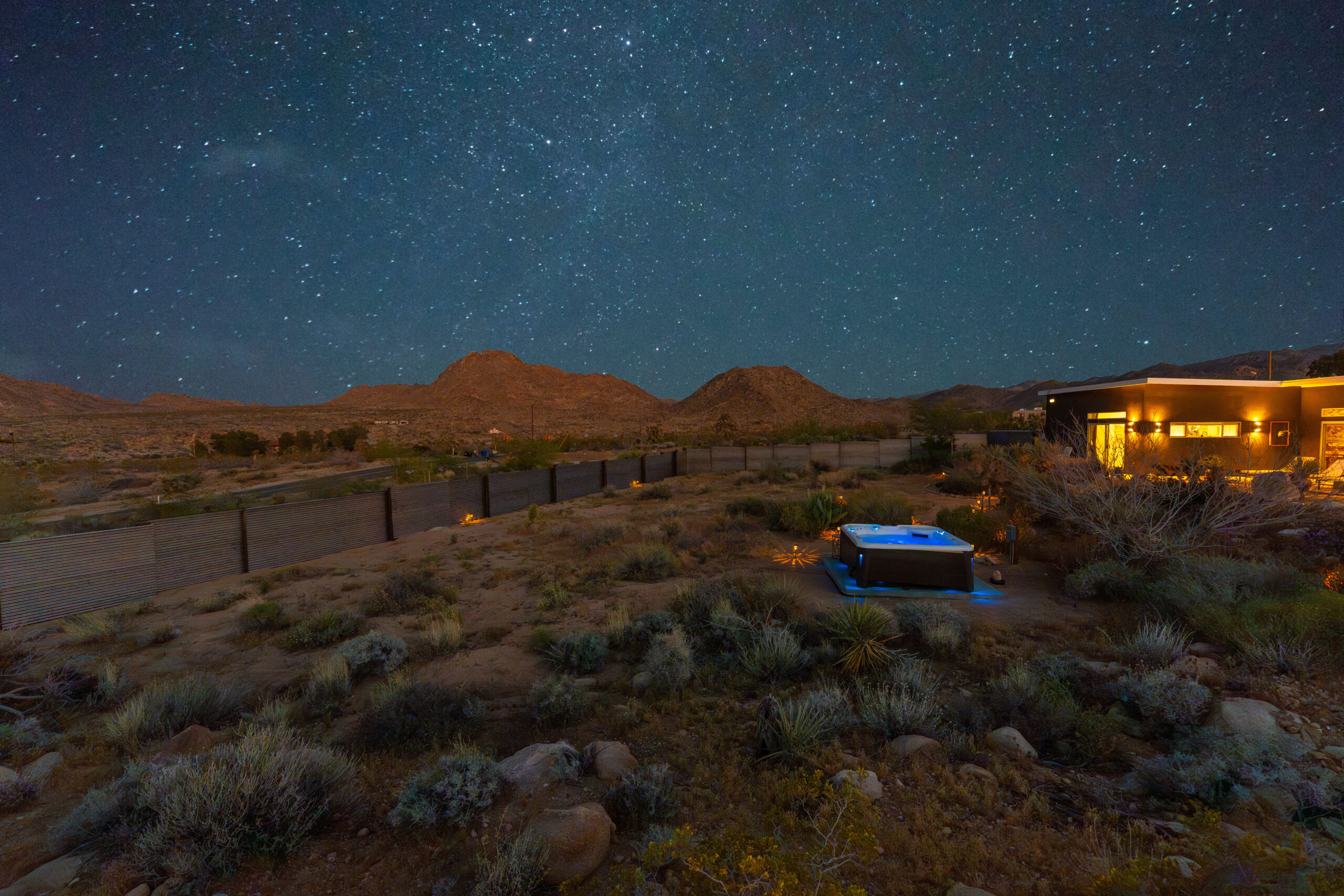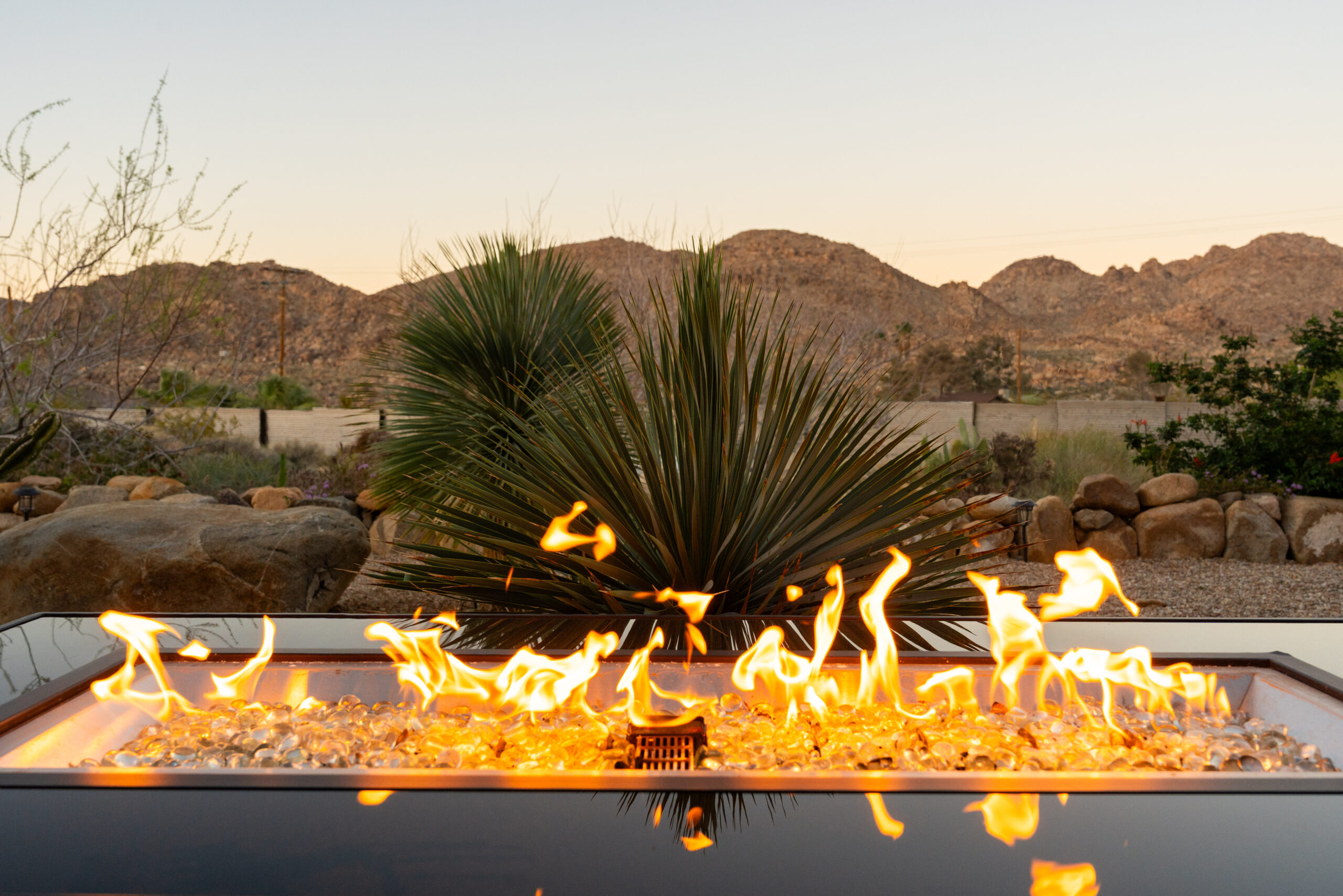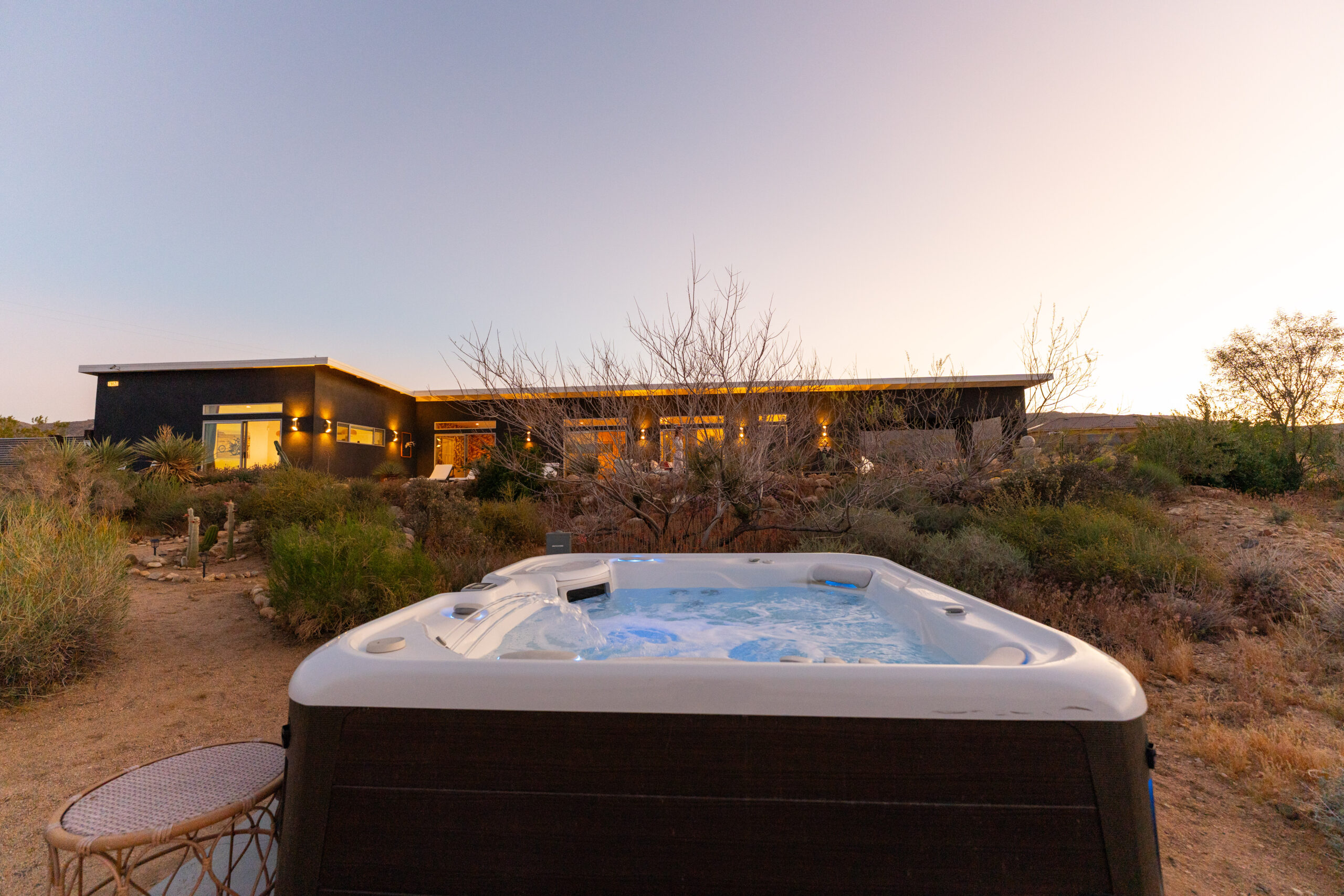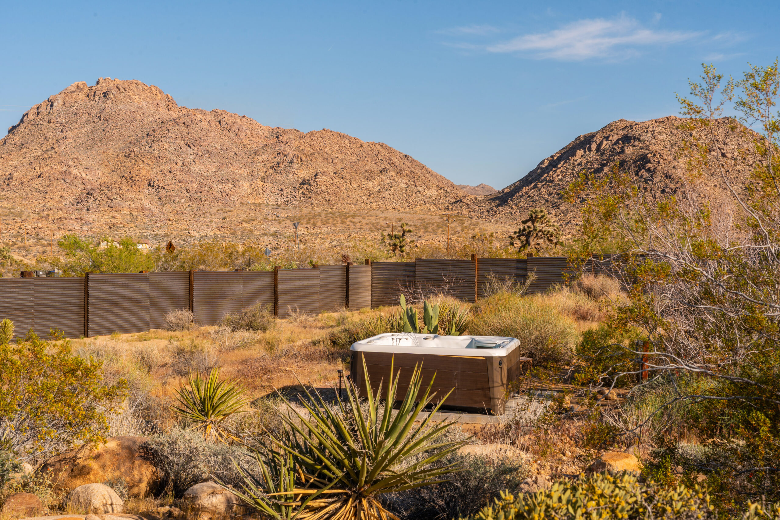 Newly remodeled, Desert Dawn is a fully fenced desert retreat set between downtown Joshua Tree and the entrance to Joshua Tree National Park. Framed by stunning boulder views, the home offers two master suites, a spa, and an east facing patio made for golden sunrises, coffee, yoga, and sound baths. Wind down by the fire pit beneath star filled skies, with your furry family welcome too.