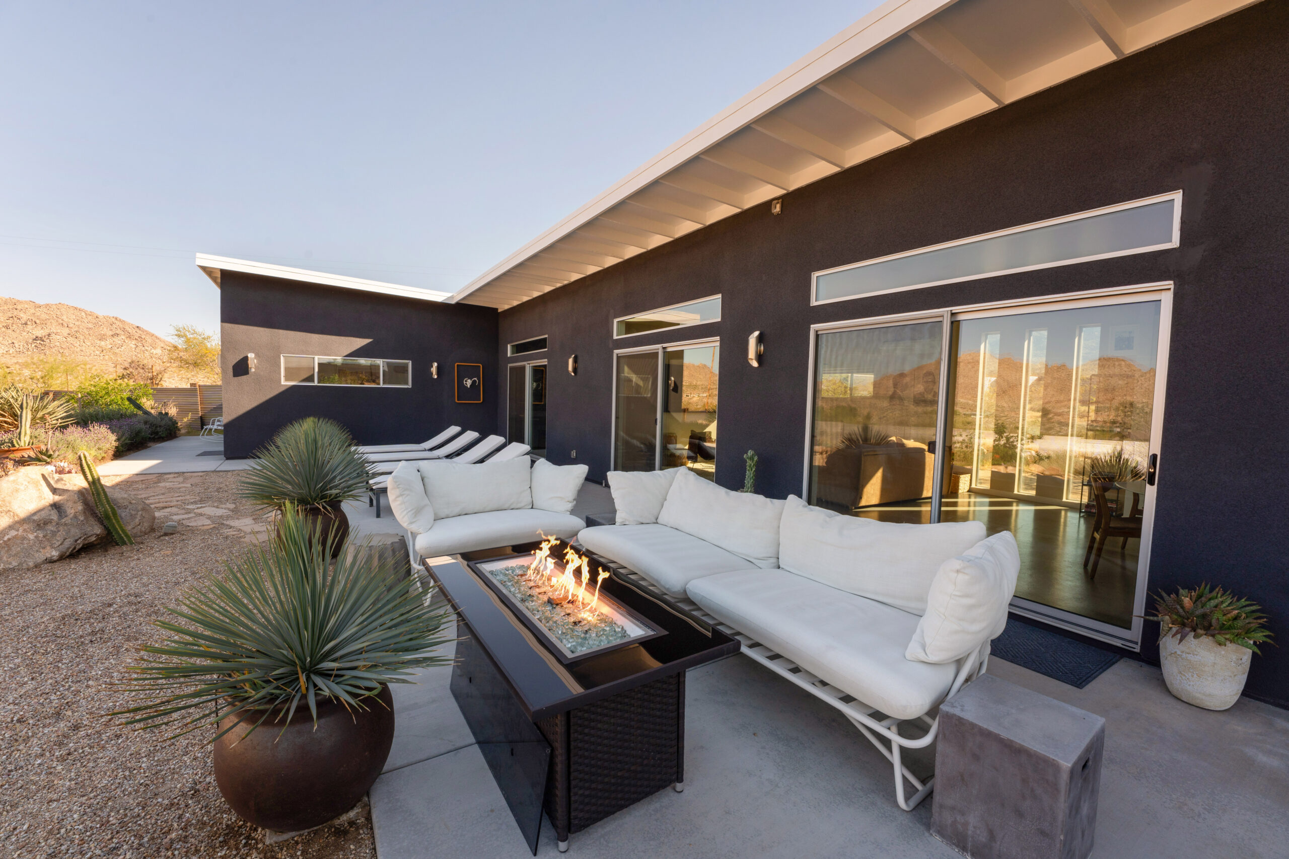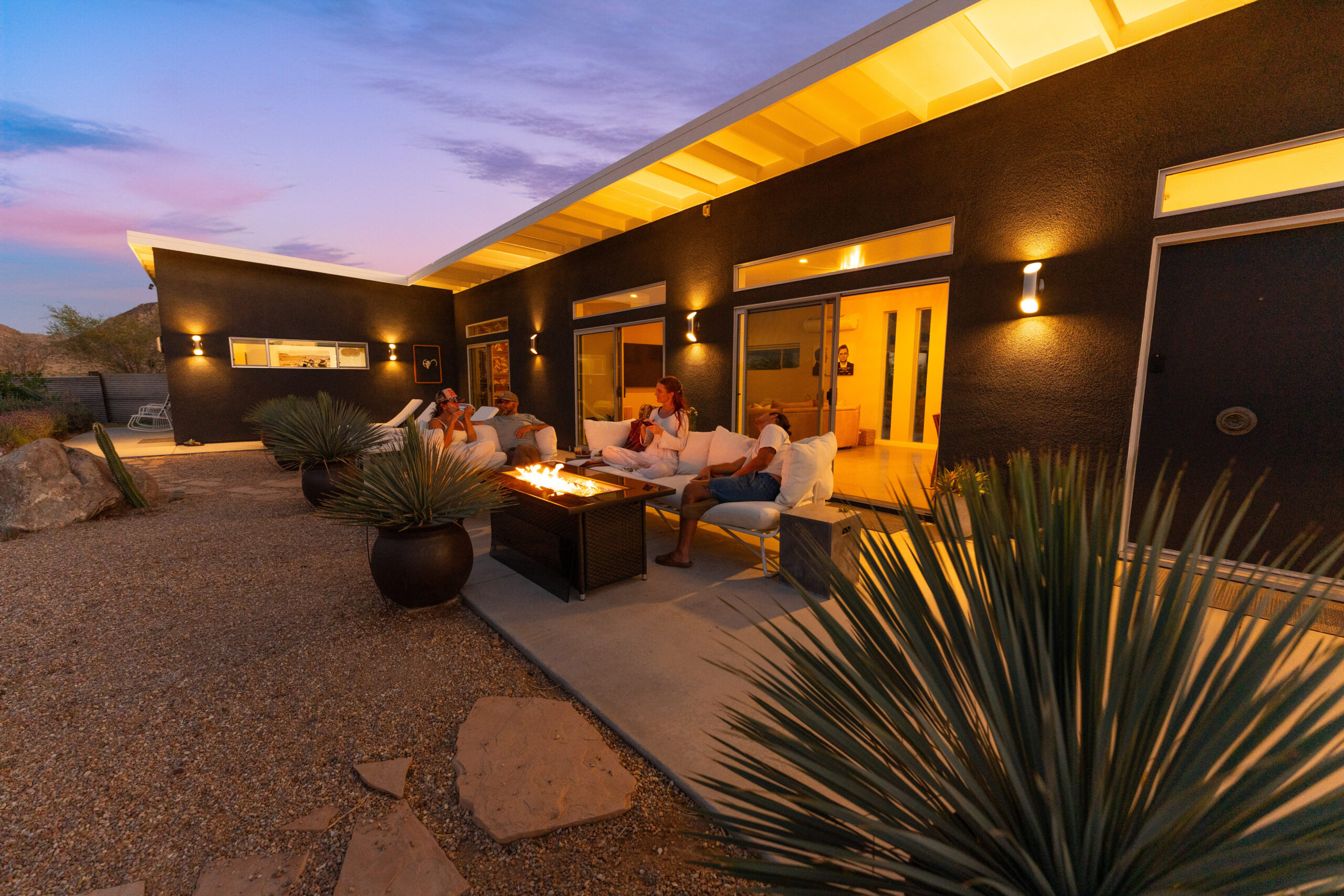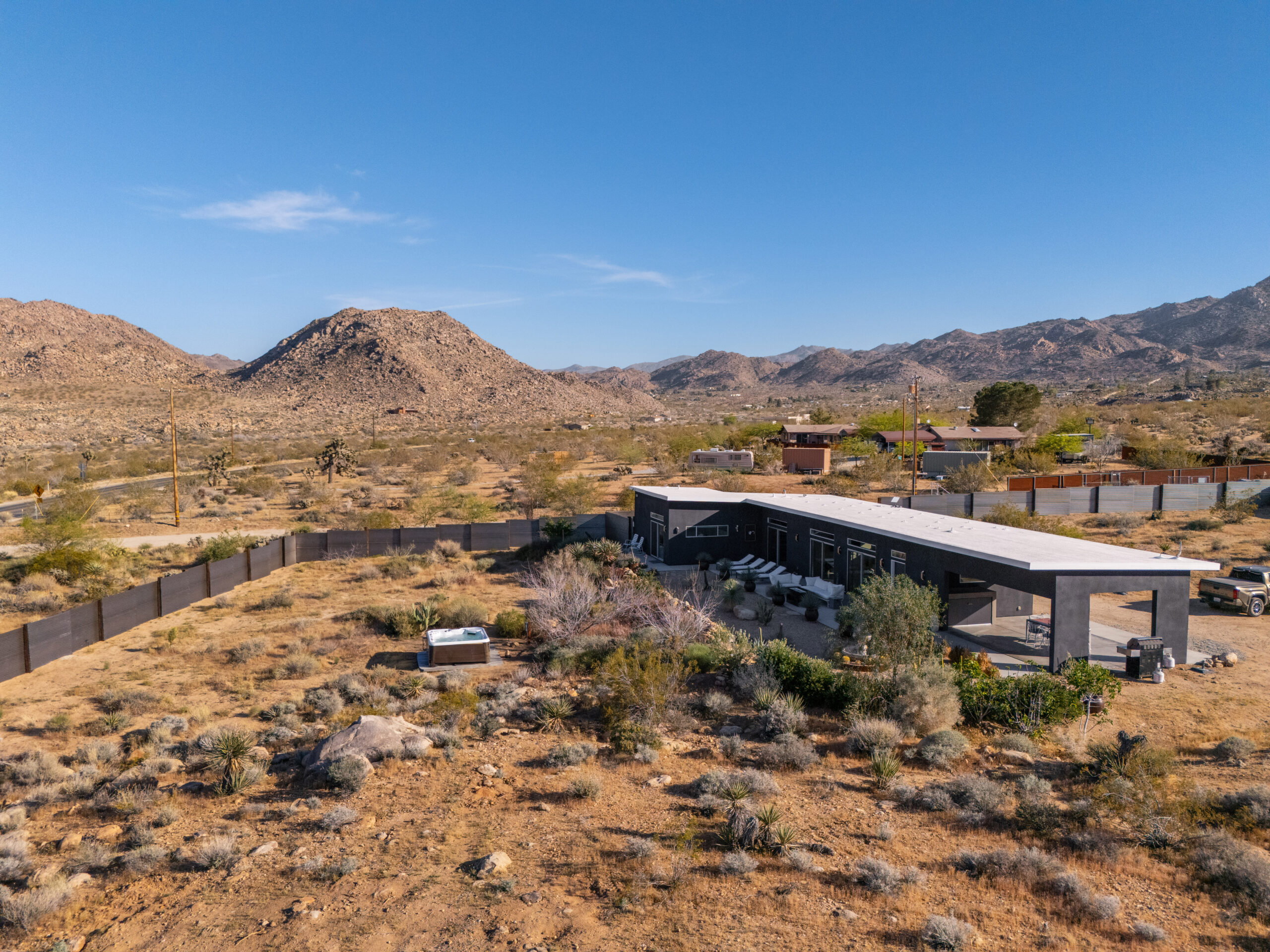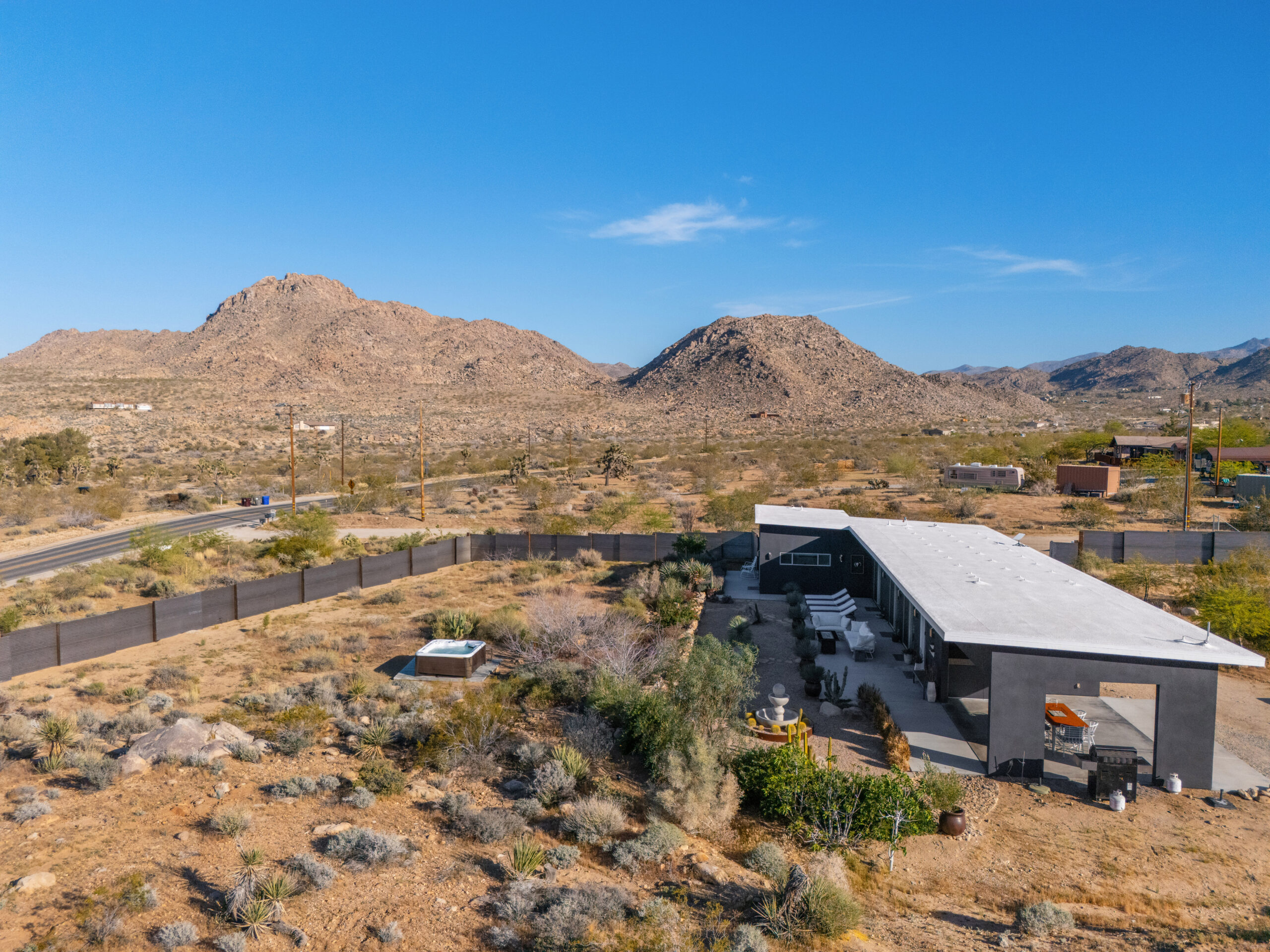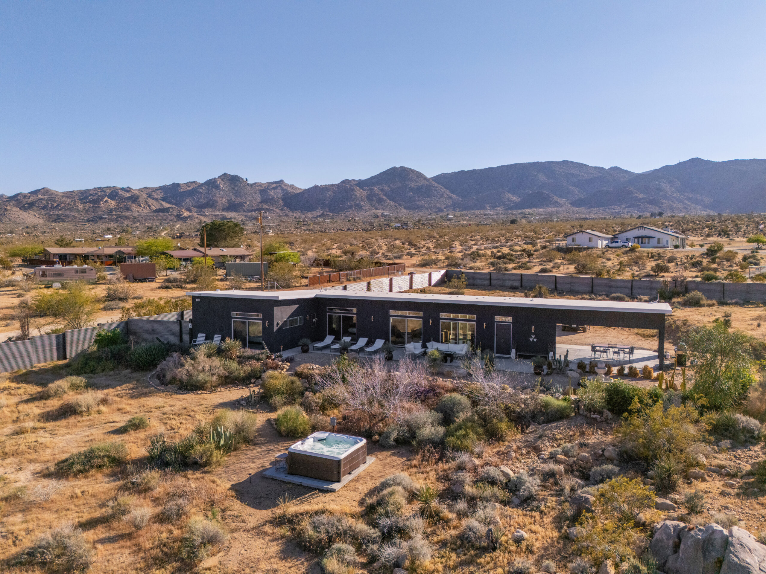 Newly remodeled, Desert Dawn is a fully fenced desert retreat set between downtown Joshua Tree and the entrance to Joshua Tree National Park. Framed by stunning boulder views, the home offers two master suites, a spa, and an east facing patio made for golden sunrises, coffee, yoga, and sound baths. Wind down by the fire pit beneath star filled skies, with your furry family welcome too.