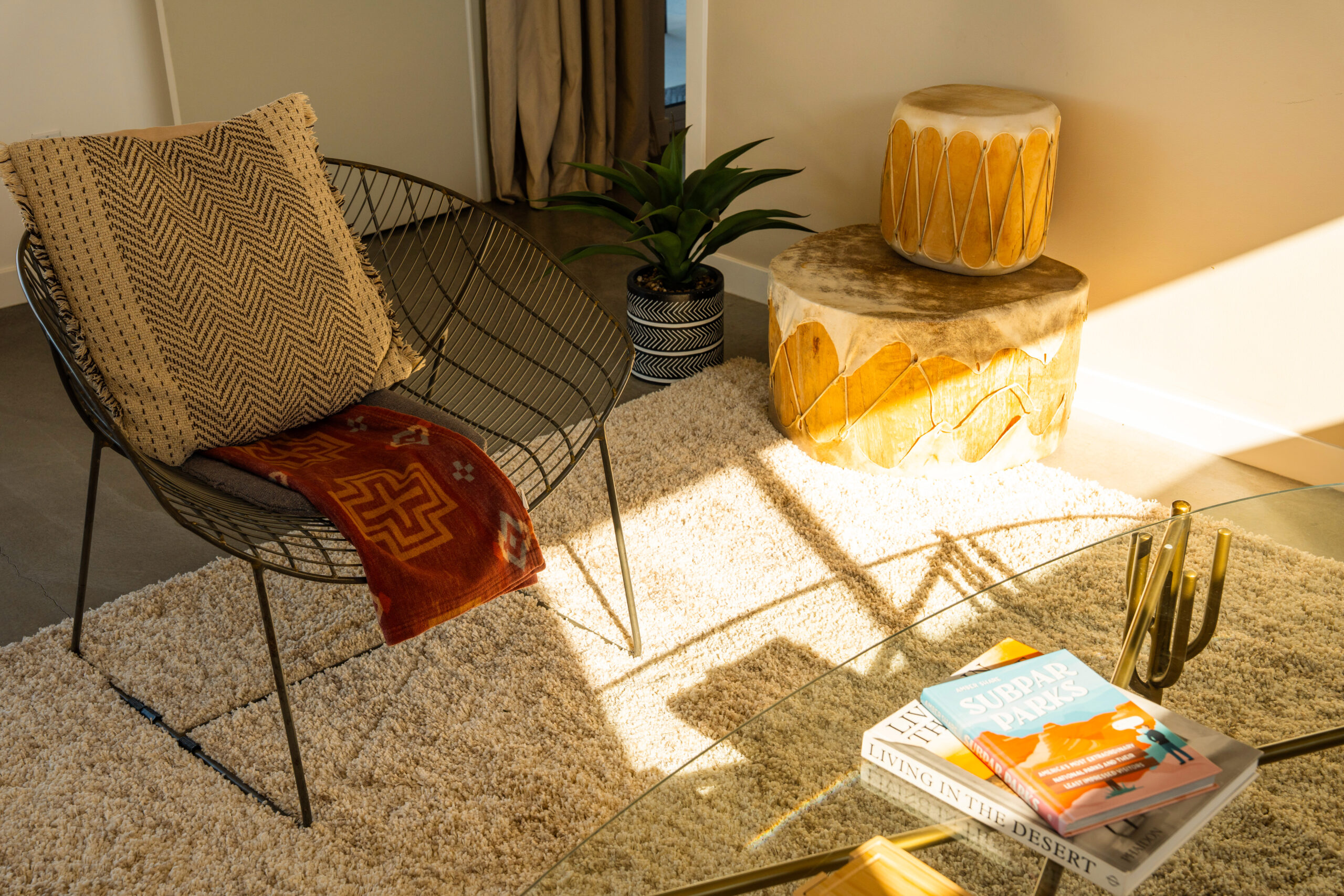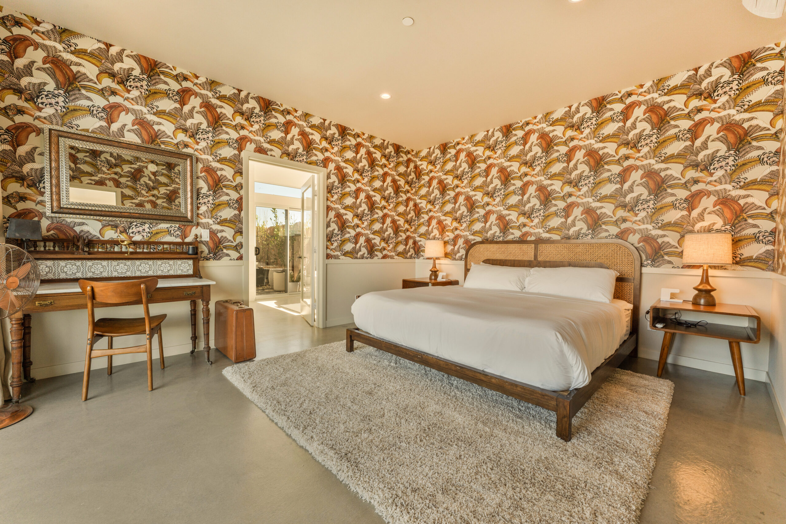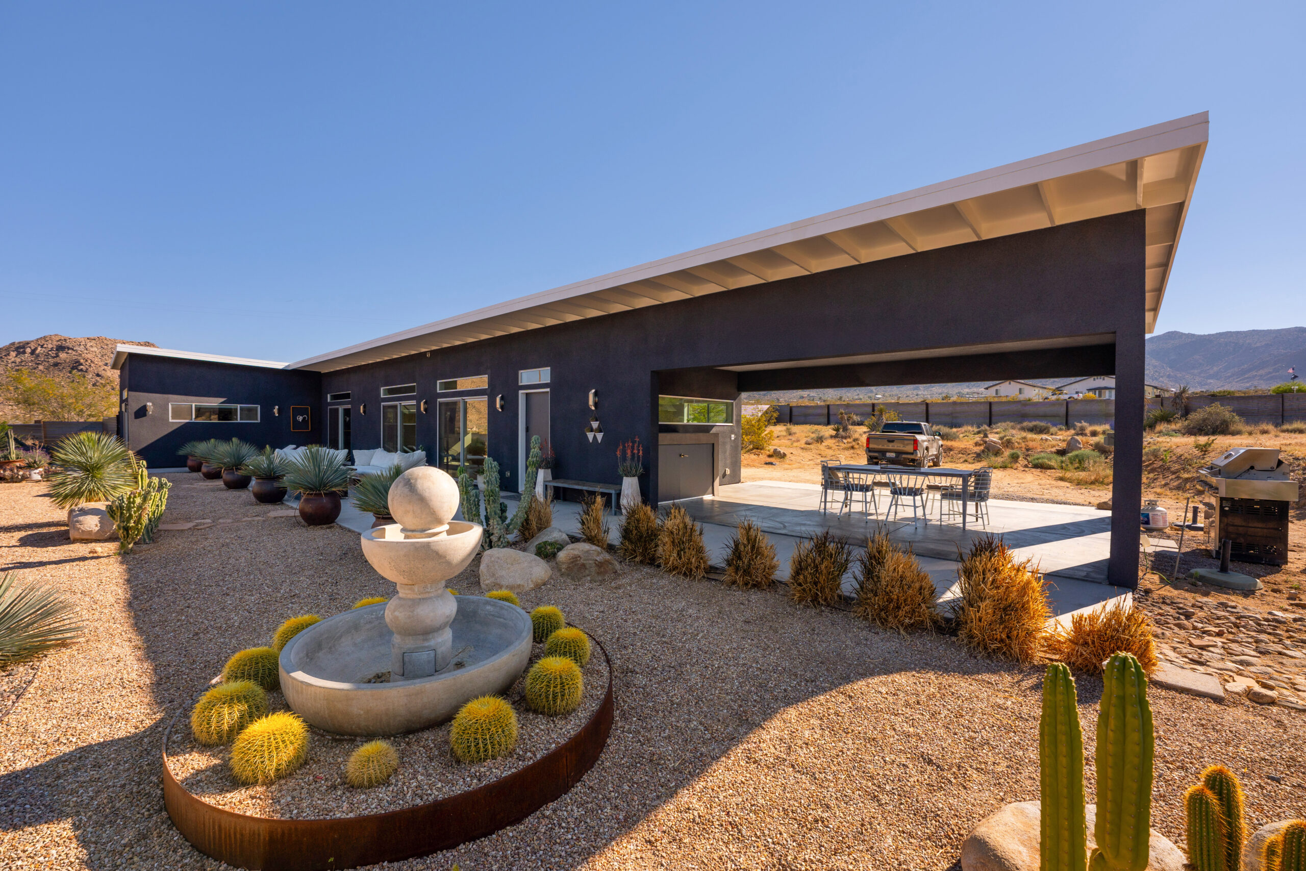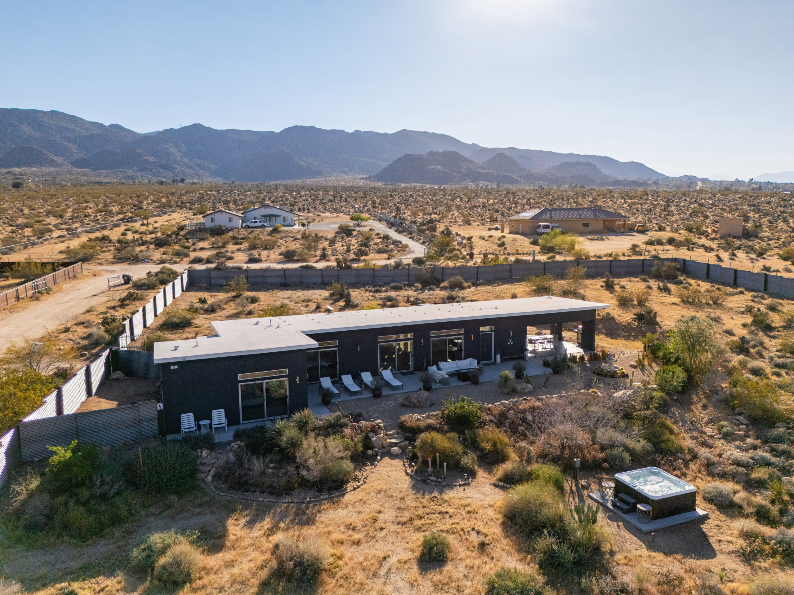 Newly remodeled, Desert Dawn is a fully fenced desert retreat set between downtown Joshua Tree and the entrance to Joshua Tree National Park. Framed by stunning boulder views, the home offers two master suites, a spa, and an east facing patio made for golden sunrises, coffee, yoga, and sound baths. Wind down by the fire pit beneath star filled skies, with your furry family welcome too.